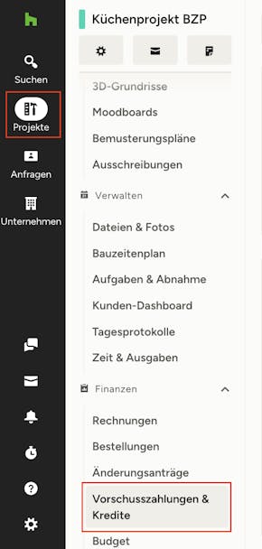 Gehen Sie auf das „Projekte“-Symbol im linken Menü, und wählen Sie das entsprechende Projekt aus. Wählen Sie im linken Menü dieses Projekts im Bereich „Finanzen“ die Option „Vorauszahlungen & Kredite“ aus.