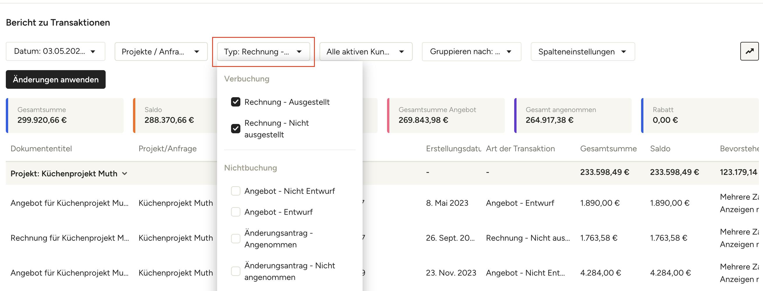 2. Nutzen Sie die oberen Filter, um die Ergebnisse so einzugrenzen, dass nur Rechnungen angezeigt werden, und das spezifische Projekt, das Sie anzeigen möchten. Klicken Sie auf „Änderungen anwenden“, um die Berichtsdaten zu aktualisieren.