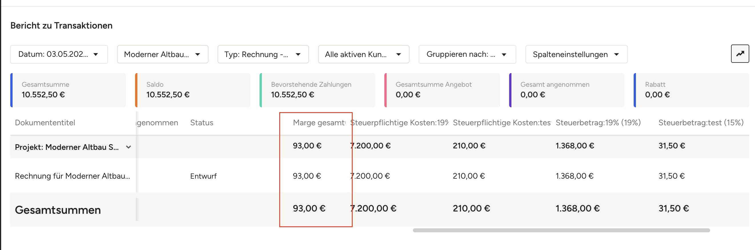 3. Scrollen Sie im Bericht nach rechts, bis Sie die Spalte „Marge gesamt“ sehen (wenn Sie diese Spalte nicht finden können, vergewissern Sie sich, dass sie oben in den Spalteneinstellungen aktiviert ist). Unten in dieser Spalte sehen Sie in der Zeile „Gesamtsummen“ die Gesamtmarge für das Projekt.