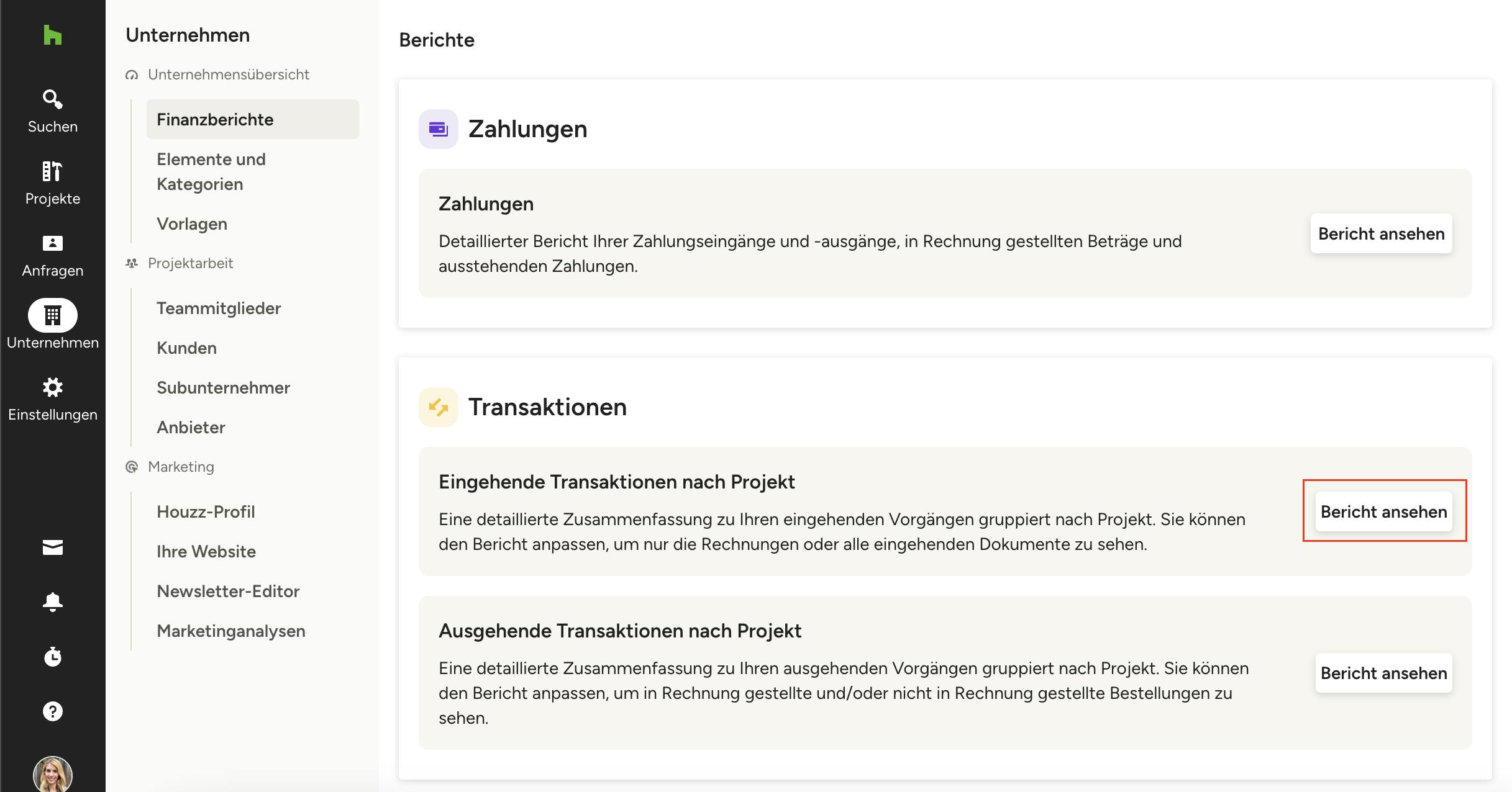 1. Öffnen Sie auf Ihrer Übersichtsseite zu Berichten den Bericht über eingehende Transaktionen.